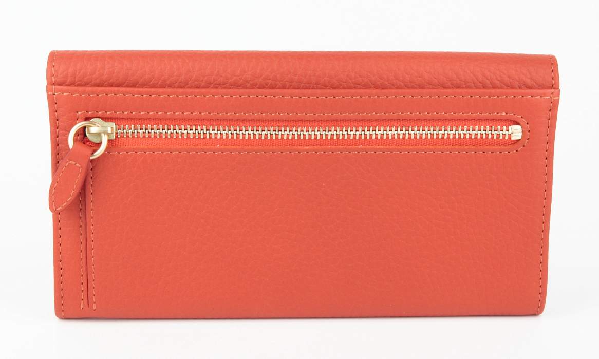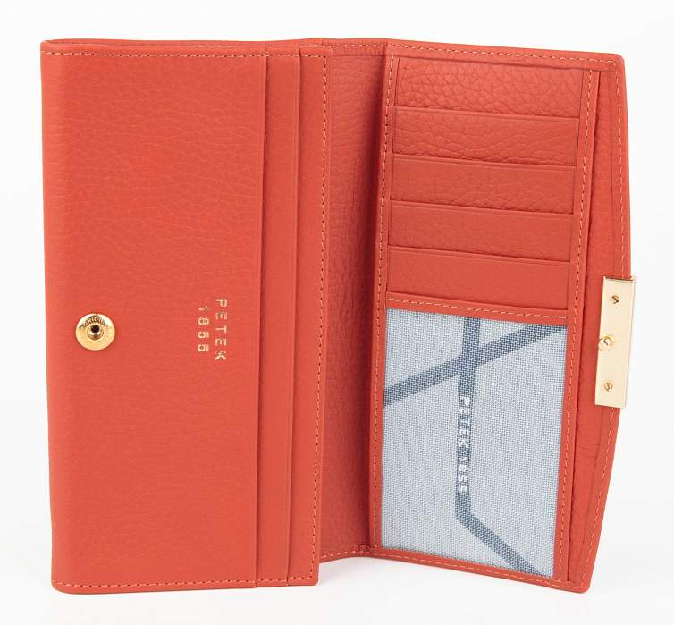 Портмоне женское полнокупюрное из новой коллекции Petek1855. Внутри одно основное отделение для купюр и два дополнительных. На закрывающем блоке четыре кармана для кредитных и дисконтных карт, потайной карман, а так же отделение с прозрачным окошком, например для фотографии. На оборотной стороне есть два отделения, одно из них на молнии.